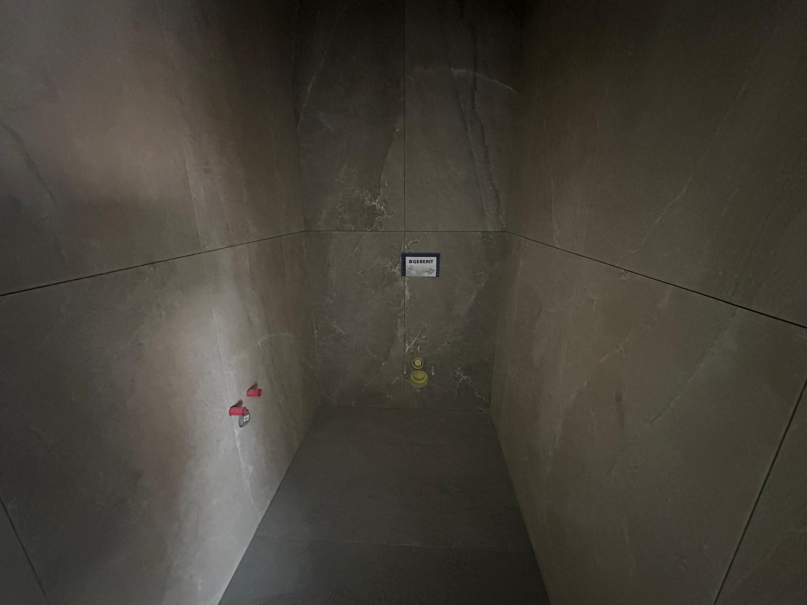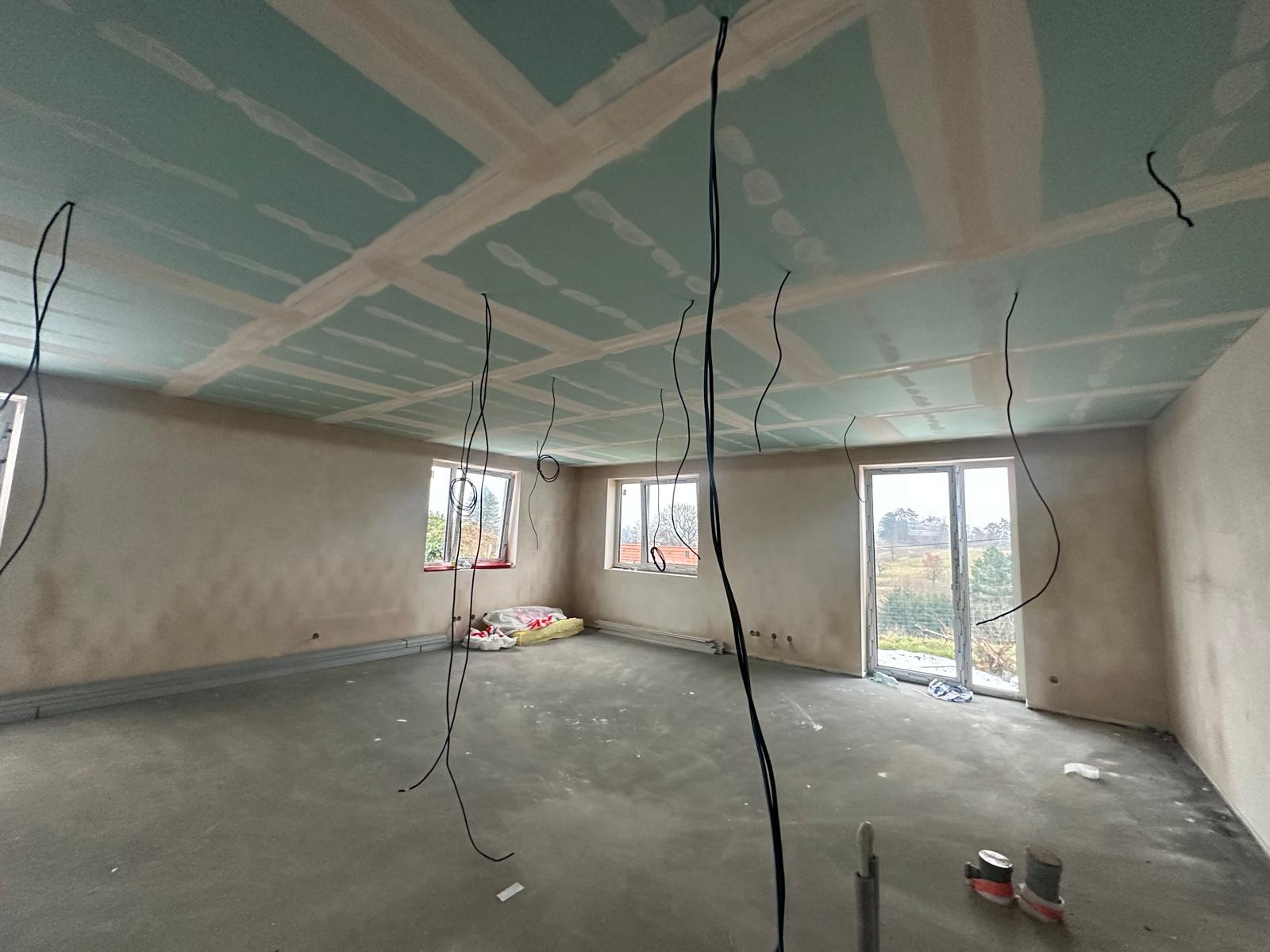 Na domě č. 11 jsou hotové sádrokartonové podhledy a obklady s dlažbami.